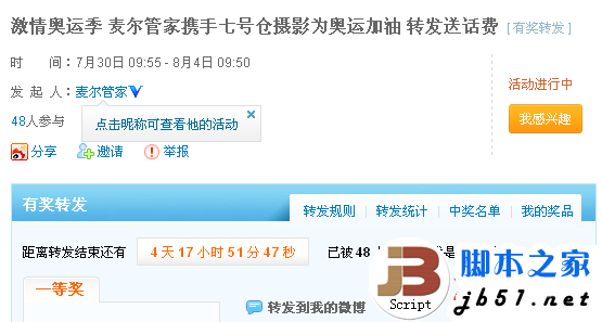 2012伦敦奥运会已经进行的如火如荼了,奥运会期间各大网、电视媒体都会全程关注最新奥运资讯,尤其是中国健儿们在奥运会上的表现。针对奥运会这样的大事件如何做好微博营销呢?昨天笔者看到一条微博信息:激情奥运季 麦尔管家携手七号仓摄影为奥运加油 转发送话费。其实类似这样的有奖活动屡见不鲜,或许广大网友们都已经很麻木了。但是看到这样的一条微博还是会有很多人去转载,因···