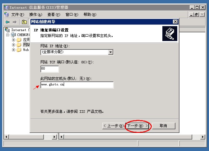 在“网站创建向导”里进行IP地址和端口的设置,保留“网站IP地址”和“网站TCP窗口”默认值不变,只是在“此网站的主机头”位置的文本框里输入网站的域名,然后点击“下一步”继续。如图所示: