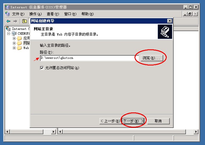 在“网站创建向导”里进行“网站主目录”的设置,点击“浏览”按钮,选择之前放置网站程序的文件夹,确定后路径将会自动生成,然后点击“下一步”继续。如图所示: