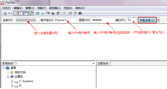 运行FileZilla,按下图所示进行配置,配置后点击“快速链接”: