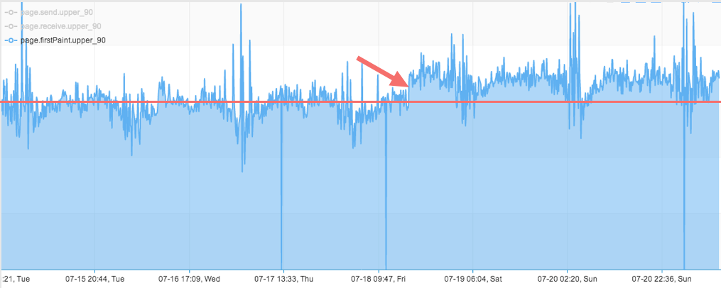 《高性能网站进阶指南》上提到要尽快输出文档的第首字节提高性能,美团很早的时候做了这个事情,但是从数据上看,在页面完全加载时间上的收益不大,做了更细的数据采集之后,美团快速的在线上做了这样的实验:在特定页面把 Flush Early 关掉,结果发现,浏览器接收到第 1 个字节的时间增加了 100 ms,如下图(红色箭头表示变更上线时间点):