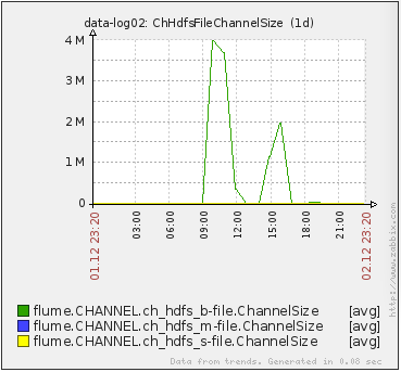 上述的情况会导致HdfsSink写Hdfs的效率极差。下图是单Channel的情况下每小时的发送量和写hdfs的时间趋势图。