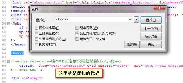 七、如果你是使用的固定位代码,那么找到主题下的single.php文件,查找”the_content”,然后将代码添加到下面。截图如下: