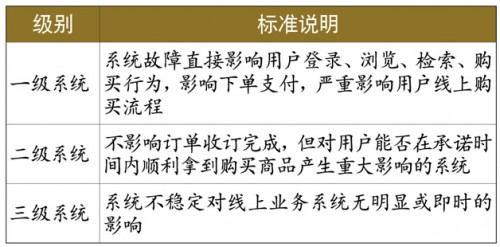 系统分级是根据不同系统的特点,结合公司业务战略关注点进行的差异化处理。电商业务链贯穿多个系统,每一个环节都不容忽视。一级系统固然是核心优化的重点,二三级别系统的技术指标要求也同样严格。
